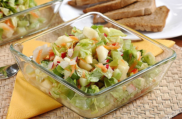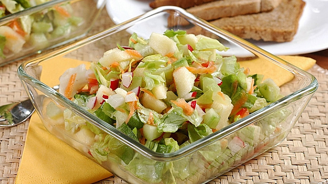 Osvěžující zeleninový salát kombinuje křupavost ředkviček a sladkou chuť jablek a mrkve. Se sladkokyselou zálivkou vytvoří lehkou, barvami zářící misku plnou vitamínů. Skvěle se hodí jako příloha k masu i rychlá večeře.