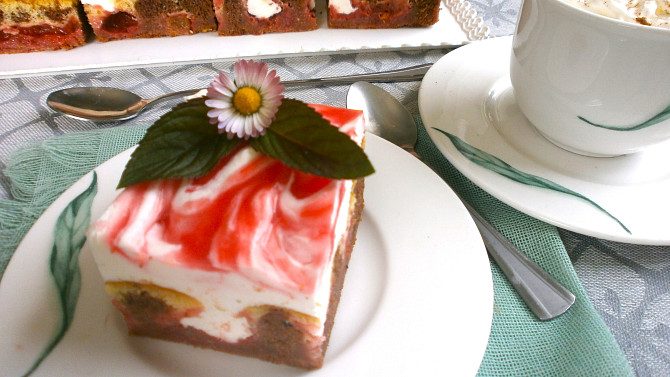 Nadýchané kakaové těsto upečeme na plechu, doplníme jahodovým pudinkem a po vychladnutí potřeme šlehačkou. Povrch zalijeme dortovým želé a necháme ztuhnout. Výsledkem je svěží letní moučník s ovocnou chutí.