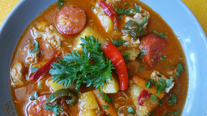 Hutná gulášová polévka s hovězím masem, bramborami a klobásou, jejíž chuť krásně prohlubuje červené víno. Voňavá kombinace papriky, česneku a koření vytváří bohatou, sytou polévku inspirovanou maďarskou kuchyní.