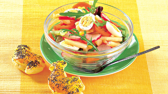 Ochutnejte lehký a pestrý salát s křepelčími vejci, křupavou mrkví a svěžím jablkem. V kombinaci s jemnou medovou zálivkou a pikantními ředkvičkami tvoří tato barevná vitamínová bomba ideální předkrm nebo stylovou fit večeři.