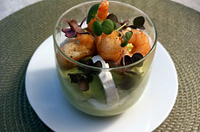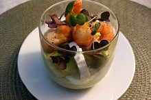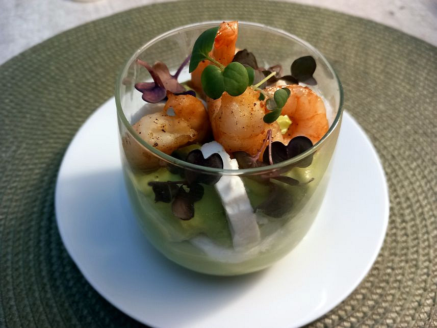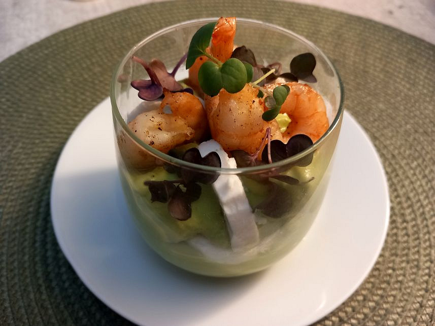 Avokádový krém s čerstvým kozím sýrem a krevetami