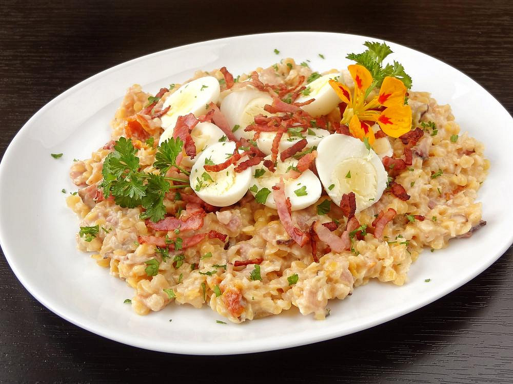 Krok 8: Hotový pokrm rozdělíme na talíře. Doplníme orestovanou slaninou, křepelčími vajíčky, posypeme nasekanou petrželkou a podáváme.