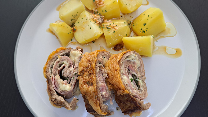 Krok 6: Hotovou roládu nakrájíme na plátky a servírujeme s bramborami nebo bramborovou kaší.