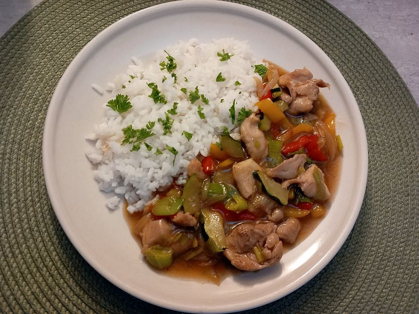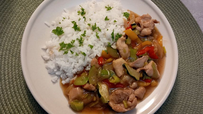 Kuřecí kousky na pórku a paprikách připravíme rychlým restováním masa se zeleninou. Vše dochutíme sójovou omáčkou, česnekem a chilli a krátce podusíme. Nakonec zahustíme a podáváme s rýží nebo těstovinami jako jednoduché a chutné jídlo.