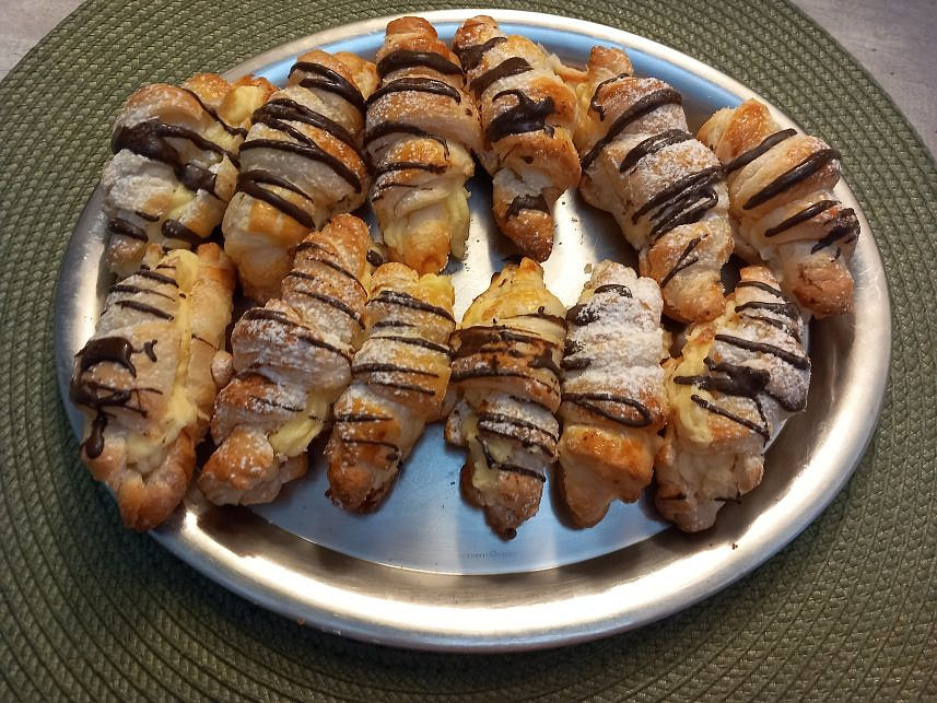 Mini croissanty připravíme z listového těsta, které nakrájíme na trojúhelníky, srolujeme a upečeme dozlatova. Po vychladnutí je rozkrojíme a naplníme jemným krémem s vaječným koňakem. Na závěr můžeme dozdobit čokoládou a pocukrovat.
