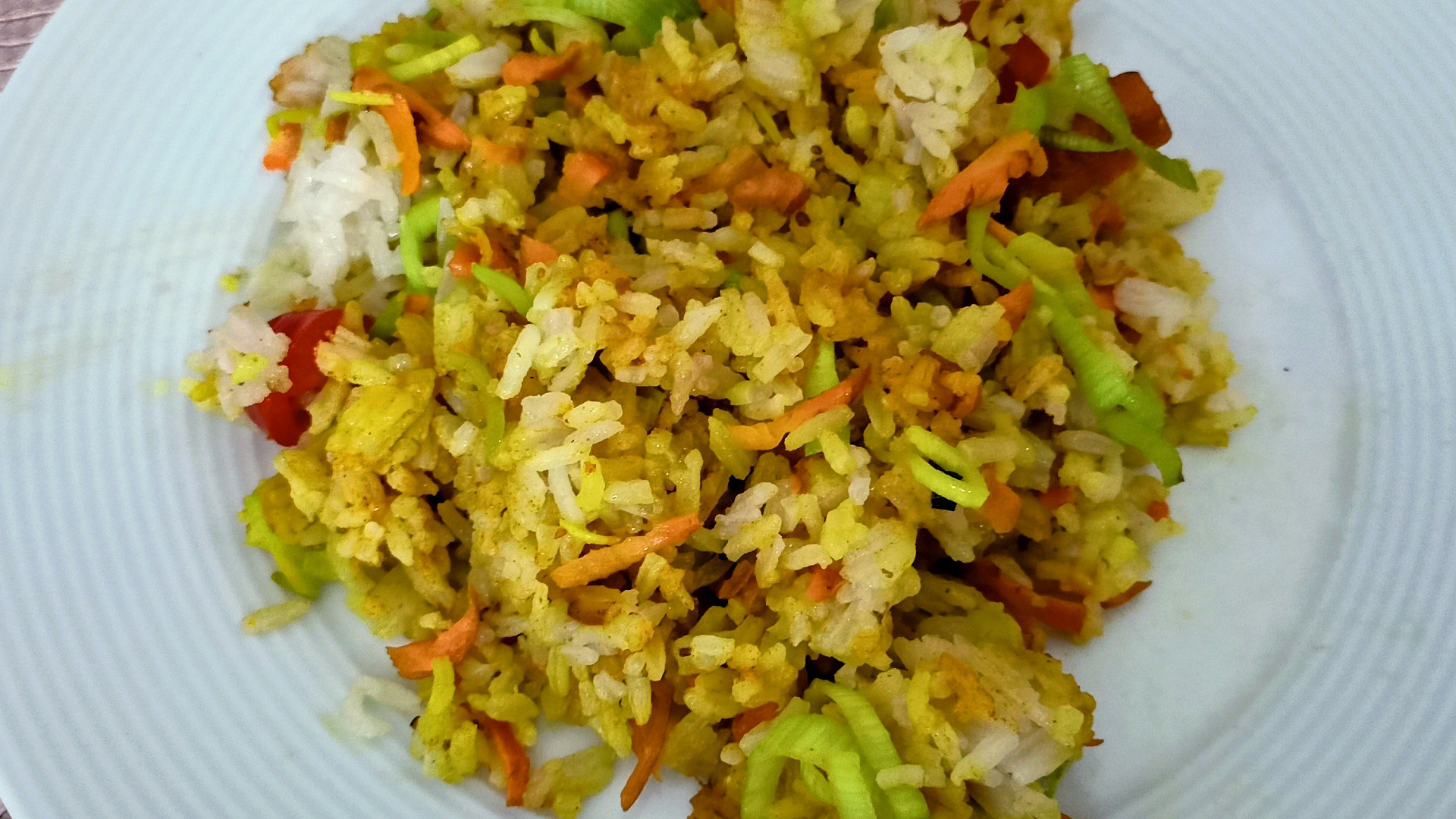 Máte doma zbytek uvařené rýže a nechcete ji vyhodit? Proměňte ji v barevné jídlo plné zeleniny. Na pánvi orestujete cibuli se špekem, přidáte mrkev, pórek, česnek i rajčátka, provoníte kari kořením a vše spojíte s rýží do lahodného pokrmu.