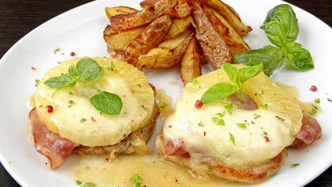 Šťavnatá vepřová pečeně v exotické kombinaci se sladkým ananasem, šunkou a jemnou mozzarellou je skutečnou delikatesou pro milovníky sladkoslaných chutí. Příprava je snadná, rychlá a výsledek báječně chutný.