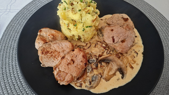 Vepřová panenka s houbami na smetaně a šťouchanými brambory