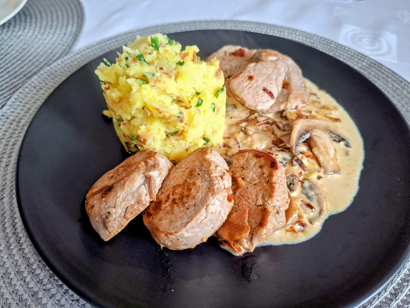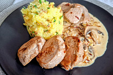 Vepřová panenka s houbami na smetaně a šťouchanými brambory