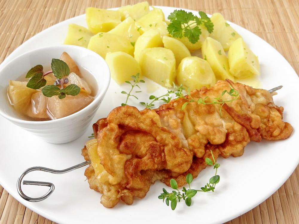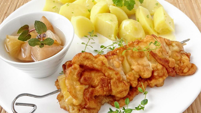 Krok 4: Připravené špízy obalíme v těstíčku a ihned vložíme do pánve s vyšší vrstvou rozehřátého oleje.
