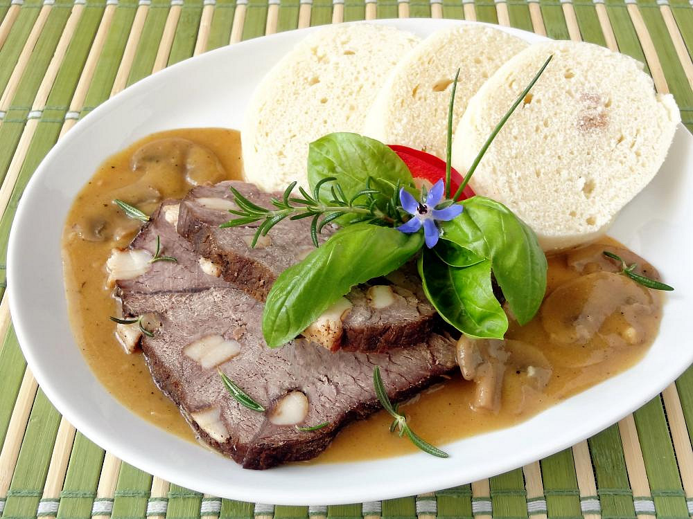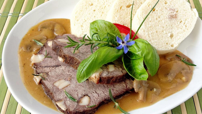 Hovězí kýta prošpikovaná slaninou, dušená na kořenové zelenině a lesních houbách s vůní divokého koření, chutná jako procházka šumavským lesem. Nejlépe chutná s nadýchaným houskovým knedlíkem.