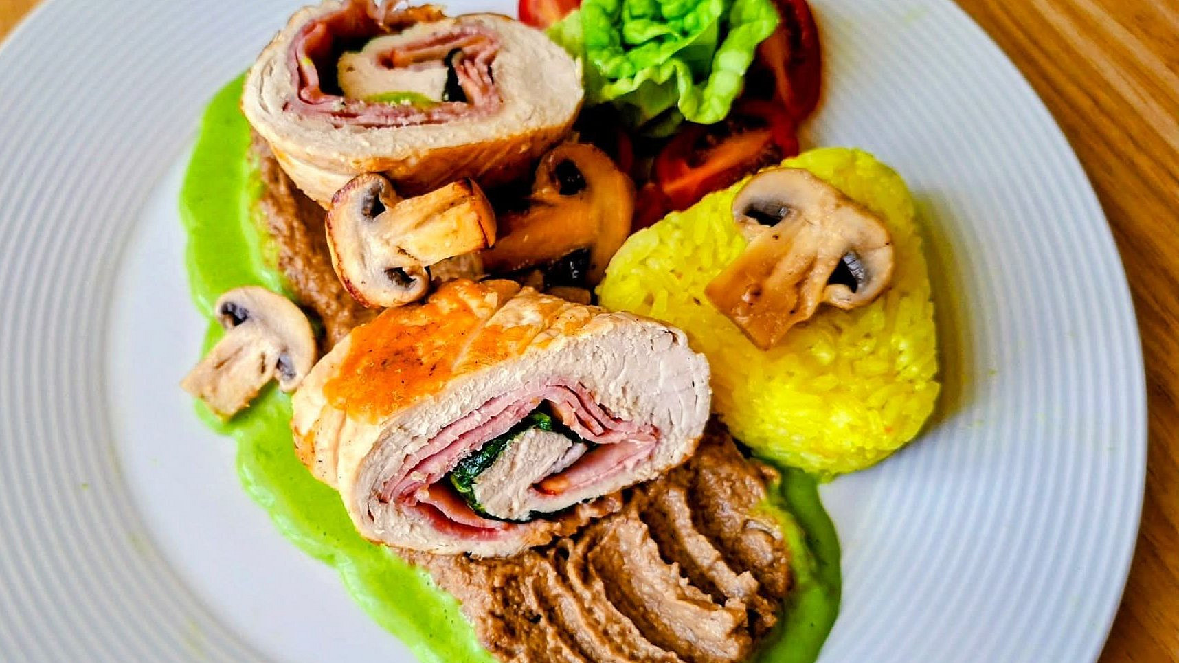 Plněná kuřecí prsa, žampionové pyré a kari rýže