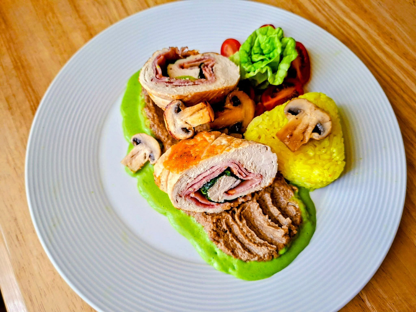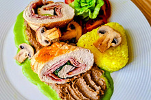 Plněná kuřecí prsa, žampionové pyré a kari rýže