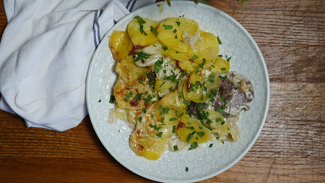 Zapečené vepřové kotlety z jednoho pekáčku podle Báry Basikové přijdou vhod, když není čas na dlouhé vaření. Plátky brambor, masa a kolečka cibule stačí jen ochutit, navrstvit do pekáčku a po chvilce pečení zalít smetanou a dopéct. Skvělý oběd s minimem špinavého nádobí a skoro bez práce.