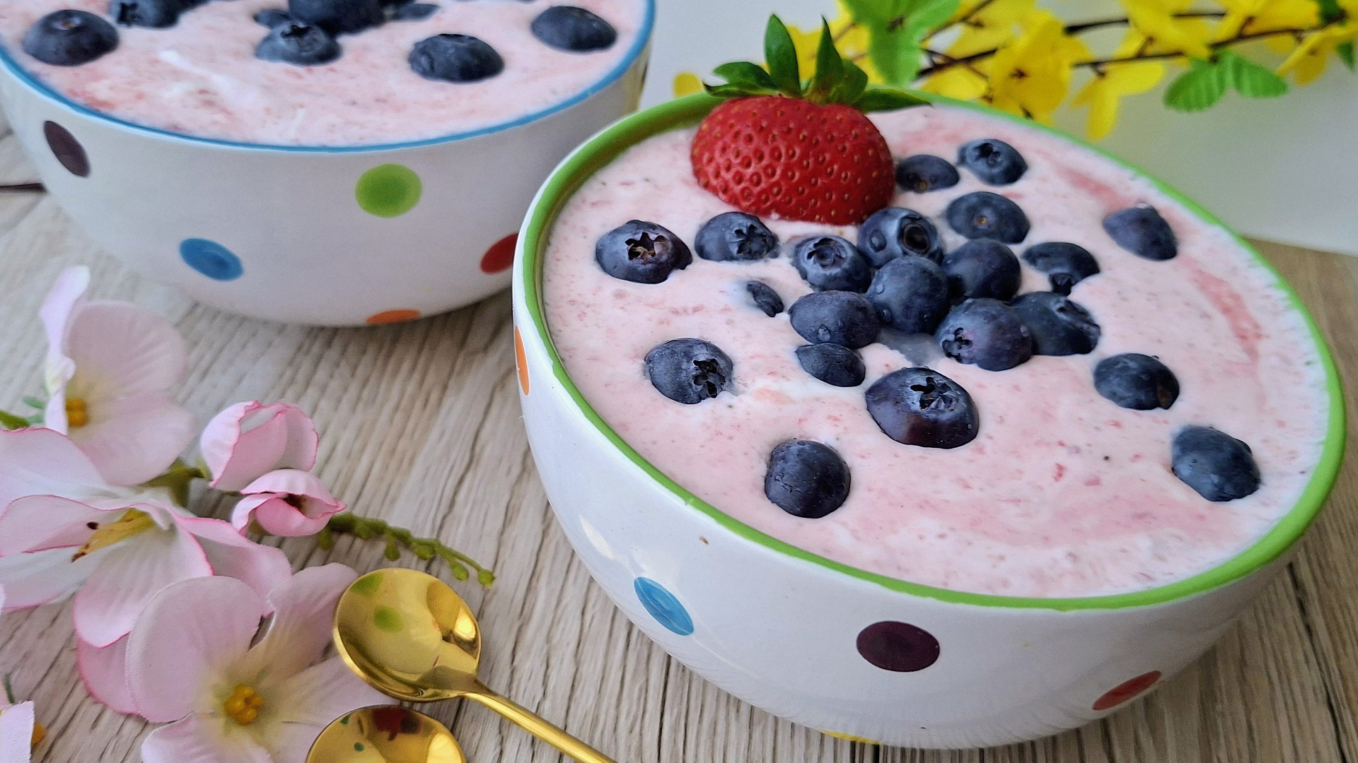Lehký tvarohový krém se šlehačkou a jahodovým pyré, ozdobený borůvkami, zvládne připravit opravdu každý. Stačí pár surovin, chvilka míchání a vznikne svěží dezert do skleničky, který potěší v létě i během celého roku.