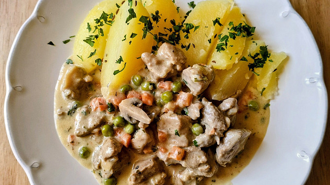 Krok 7: Vepřové frikasé se smetanou podáváme s vařenými bramborami.