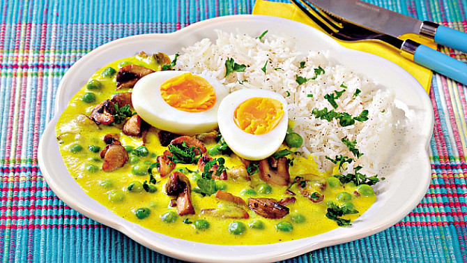 Vychutnejte si netradiční smetanovou omáčku, která vás překvapí jemně pikantní chutí kari a chilli koření. V omáčce se snoubí chuť orestovaných žampionů, hrášku a vařených vajec. Dohromady tvoří pestrý a chutný pokrm pro každý den.
