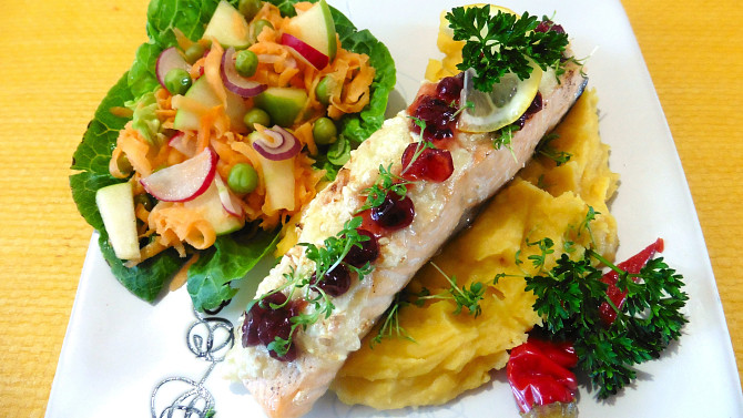 Šťavnatý losos zapečený s hermelínem v horkovzdušné fritéze, doplněný brusinkovou marmeládou, je pokrm, který zvládne připravit i začátečník, a přitom působí slavnostně. Tato lahodná kombinace chutí stojí za vyzkoušení.