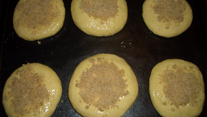 Krok 7: Těsto vyndáme z DP, rozdělíme na 6 dílů a z každého vypracujeme koláč, který pomašlujeme rozšlehaným vejcem, posypeme skořicovou drobenkou a necháme cca 10 min. nakynout.