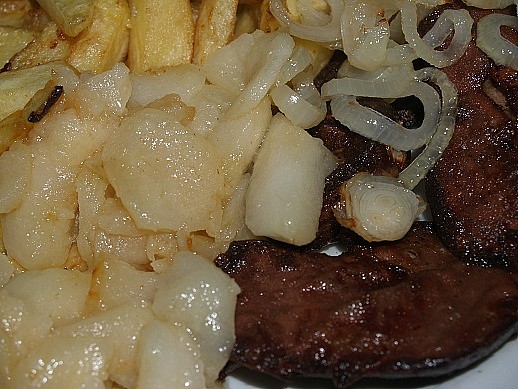 Krok 4: Hotová játra osolíme, opepříme a podáváme obložená plátky jablek a cibulí.