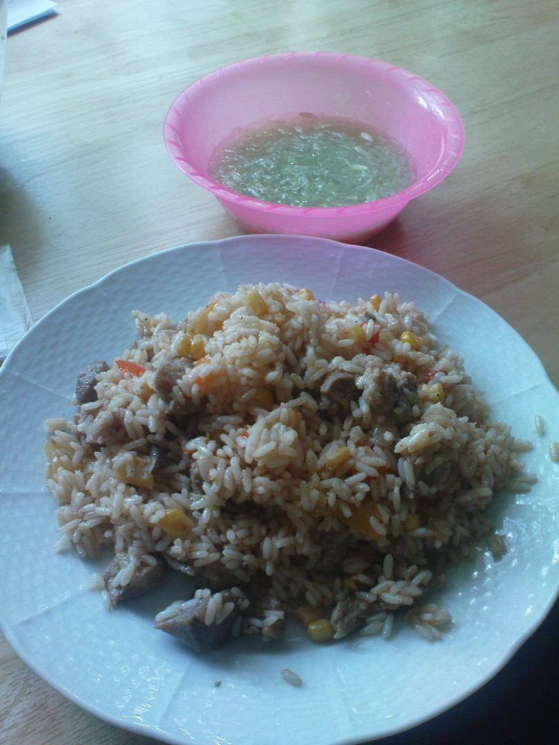 Krok 4: Přidáme uvařenou rýži, hrášek, kukuřici (kdo má rád, může přidat žampiony), mletý pepř, grilovací koření, česnek.