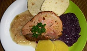 Prešpikovala som to cesnakom, Korenie som použila: pepřové korenie (s obsahom cesnaku), inak všetko ostatné ako v recepte. Piekla som to v menšom pekáči, tiež to ide. Obrátila po hodinke, dopiekla s odrytým viekom, mňamka.
