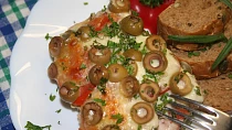 Z rozšlehaných vajec a strouhaného sýra upečeme 4 malé omeletky. Plátky masa lehce naklepeme, okořeníme, na maso položíme omeletku, plátek šunky a feferonku a přeložíme…
