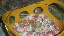 Cibuli nakrájím nadrobno, přidám trochu soli, pepře, olej, ocet a promíchám. Rajčata nakrájím na kousky, olivy na poloviny, dám do dresingu, promíchám a dám do lednice…