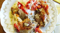 Kuře si naporcujeme, omyjeme a necháme oschnout a mezi tím si v pekáči osmažíme nakrájenou cibulku na proužky s česnekem na plátky, do sklovata. Kuře si mírně osolíme…