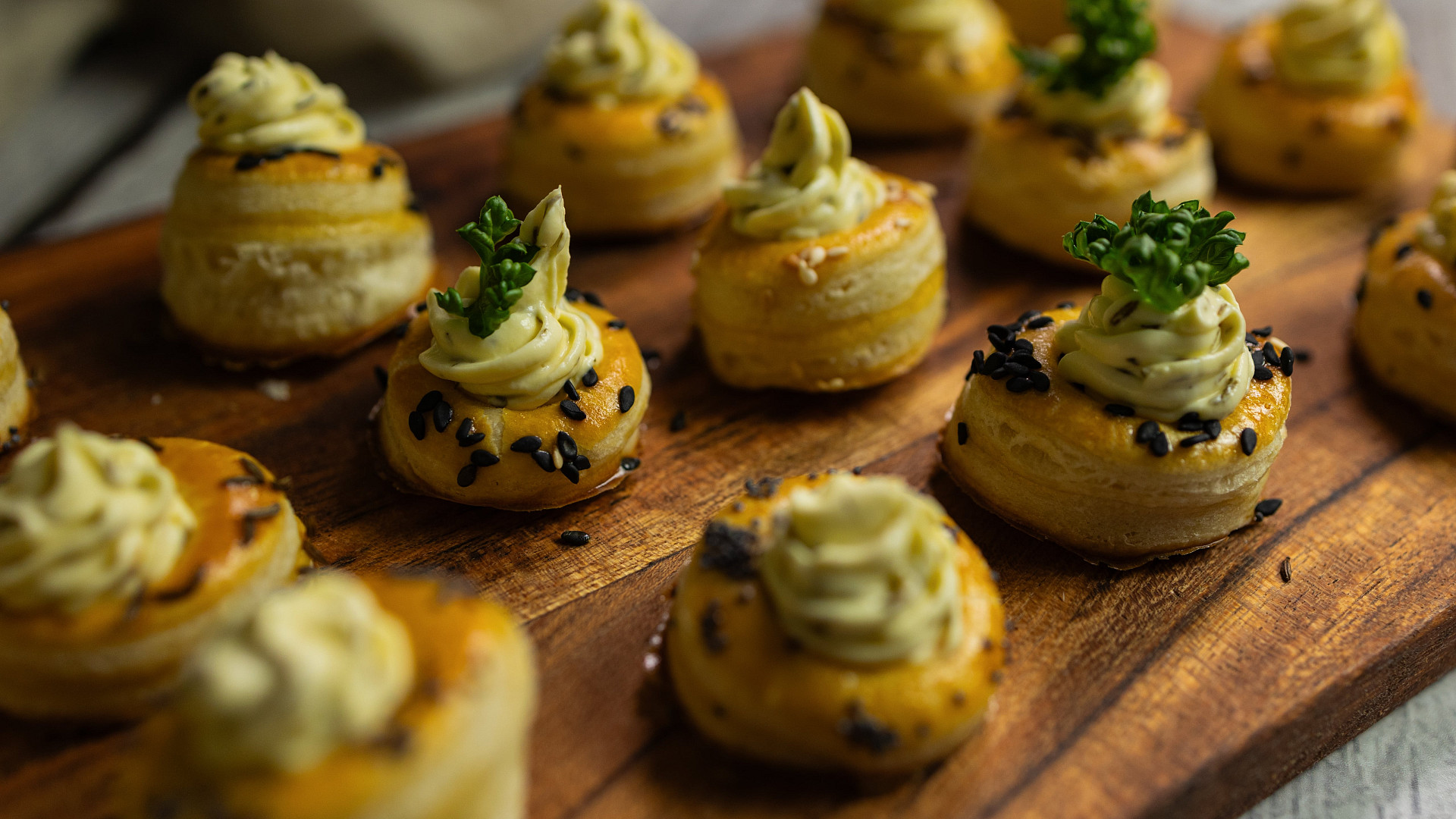 - Na 50 kusů maličkých porcí vám bude stačit 1 plát vyváleného listového těsta (o váze 275 g), 1 vejce, sezamová semínka, kmín, mák a oblíbené pomazánky.
