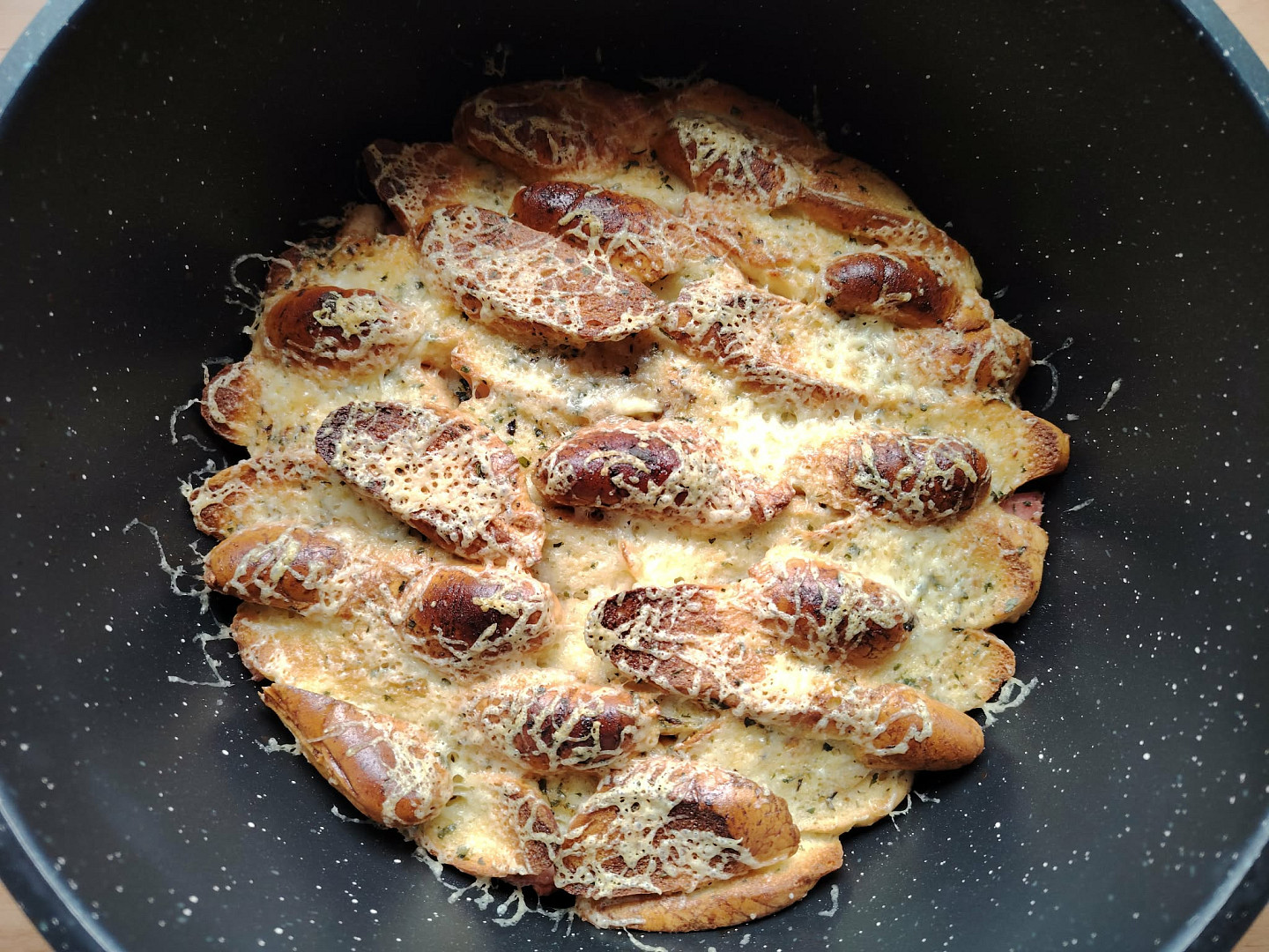 - Poslední vrstvou jsou rohlíky, na které naskládáme patičky. Pokud máme v misce zbytek mléka s vejci, nalijeme ho na žemlovku.