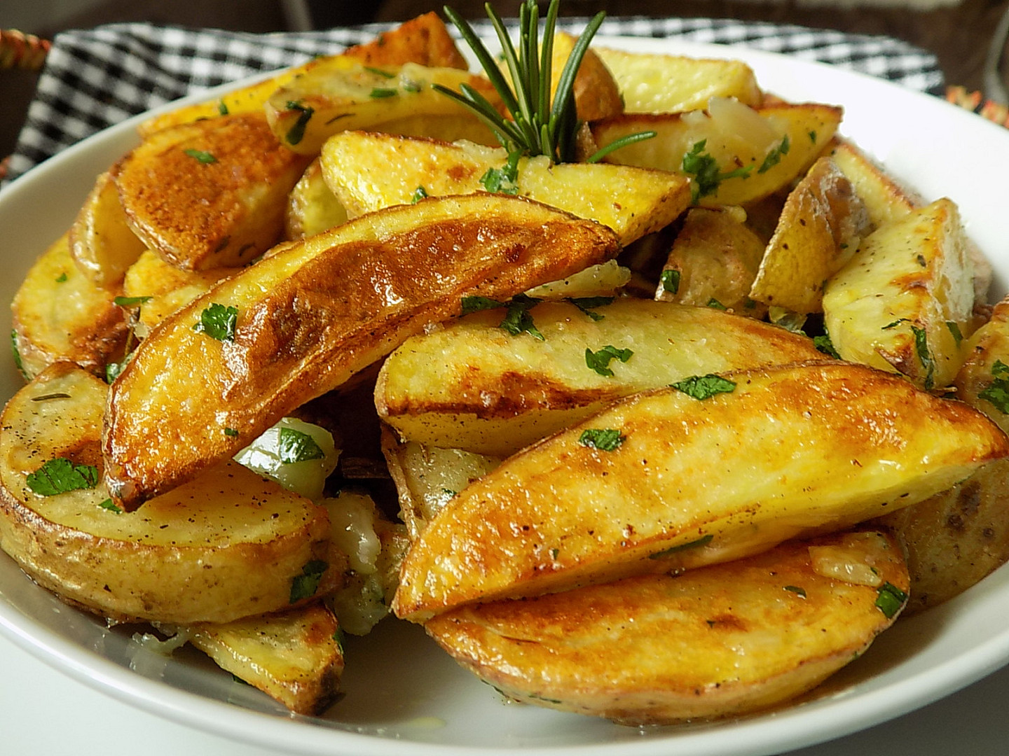 Na některá jídla ani nemusíte mít zvláštní recept. Oloupané brambory (nebo brambory se slupkou) nakrájejte na plátky nebo kostky a dejte je na plech. Omastěte je a vložte plech do trouby. Během pečení brambory občas promíchejte. Ke konci pečení přidejte utřený (nebo prolisovaný) česnek a zamíchejte jej do brambor. Můžete ještě přidat smetanu nebo nastrouhaný sýr, není to ale nutné. Pečené brambory podávejte s kefírem, jogurtem nebo mlékem a zeleninou.