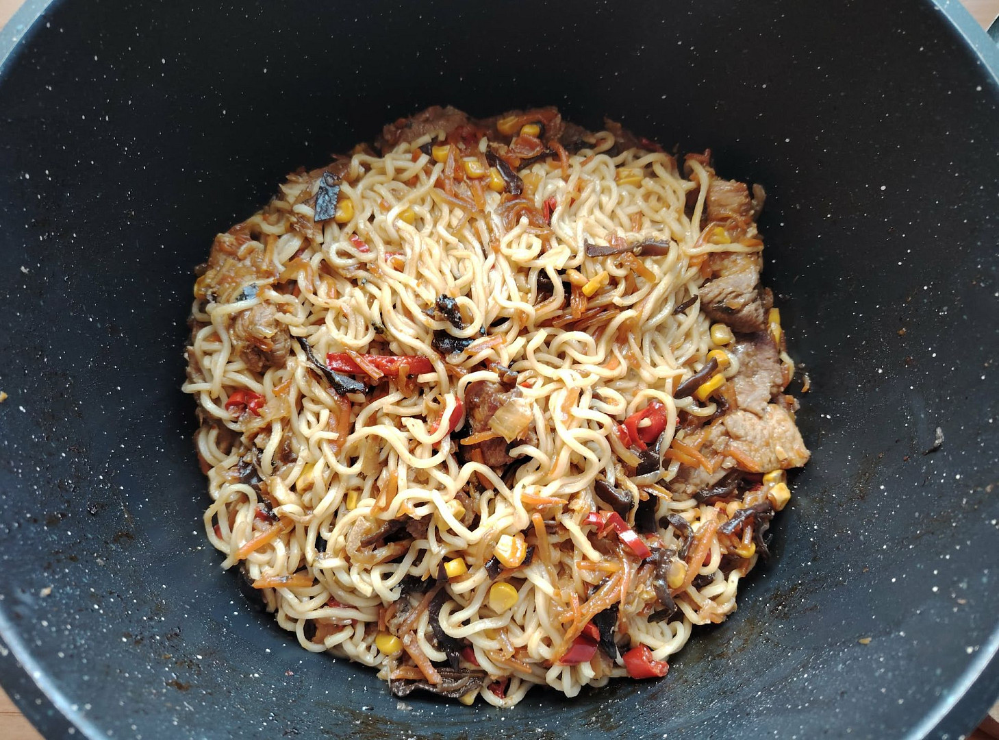 - K hotové zelenině s masem vmícháme okapané nudle, podle potřeby je ještě dochutíme a necháme pár minut péct.