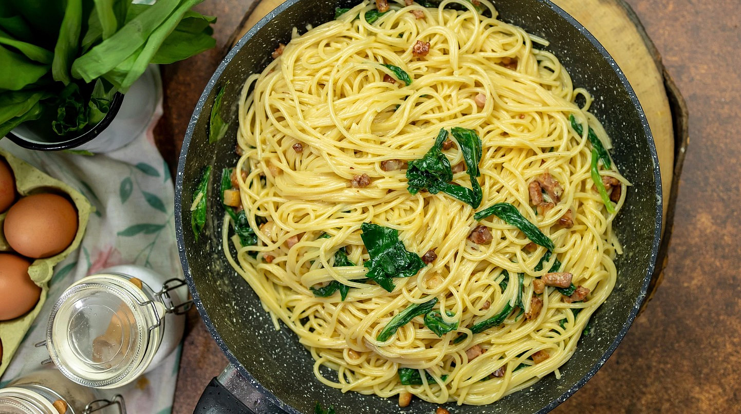 Špagety s medvědím česnekem na způsob carbonara Zdroj: Toprecepty