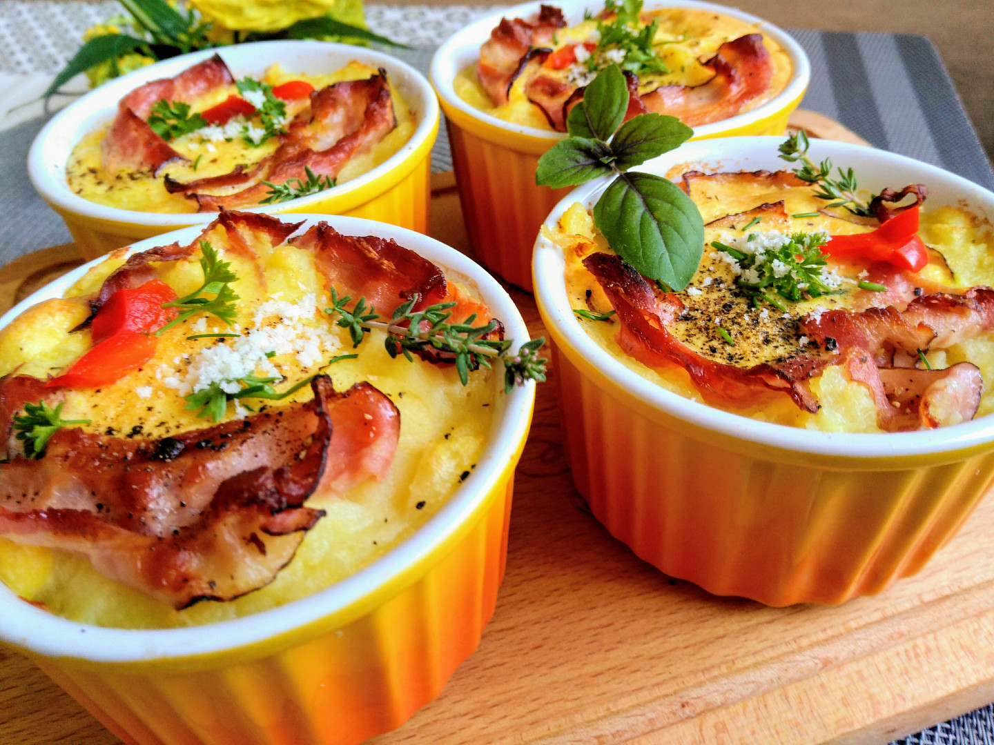 - Zapečená bramborová kaše: Když zbytky kaše promícháte s vejci, slaninou, sýrem, cherry rajčátky, kořením a dáte do trouby zapéct v malých mističkách, vznikne vám pokrm jako z luxusní restaurace.