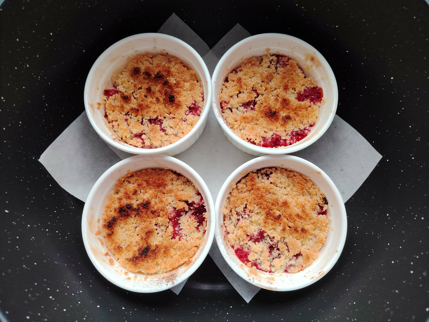 - Přiklopíme víko a začneme péct. Když povrch drobenky zčervená, můžeme kelímky vyjmout. Po částečném vychlazení si můžeme začít pochutnávat.