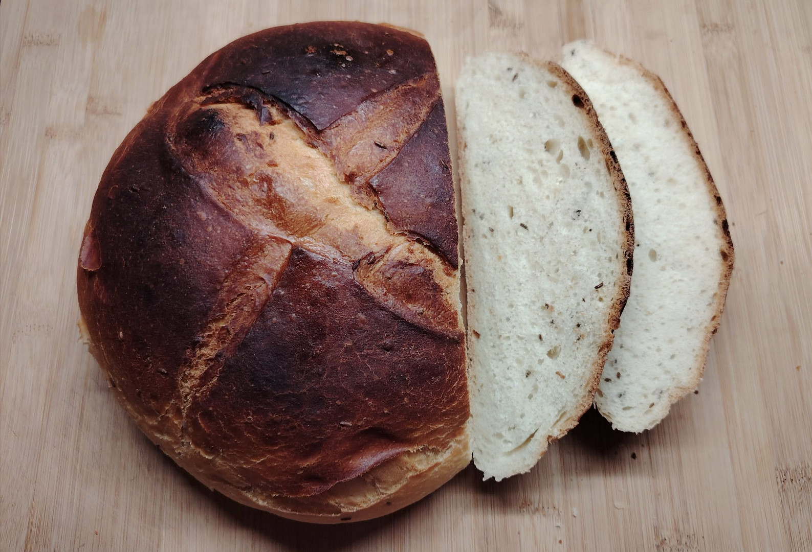 Domácí kmínový chléb, pečený v remosce. Vůni čerstvého chleba se nic nevyrovná