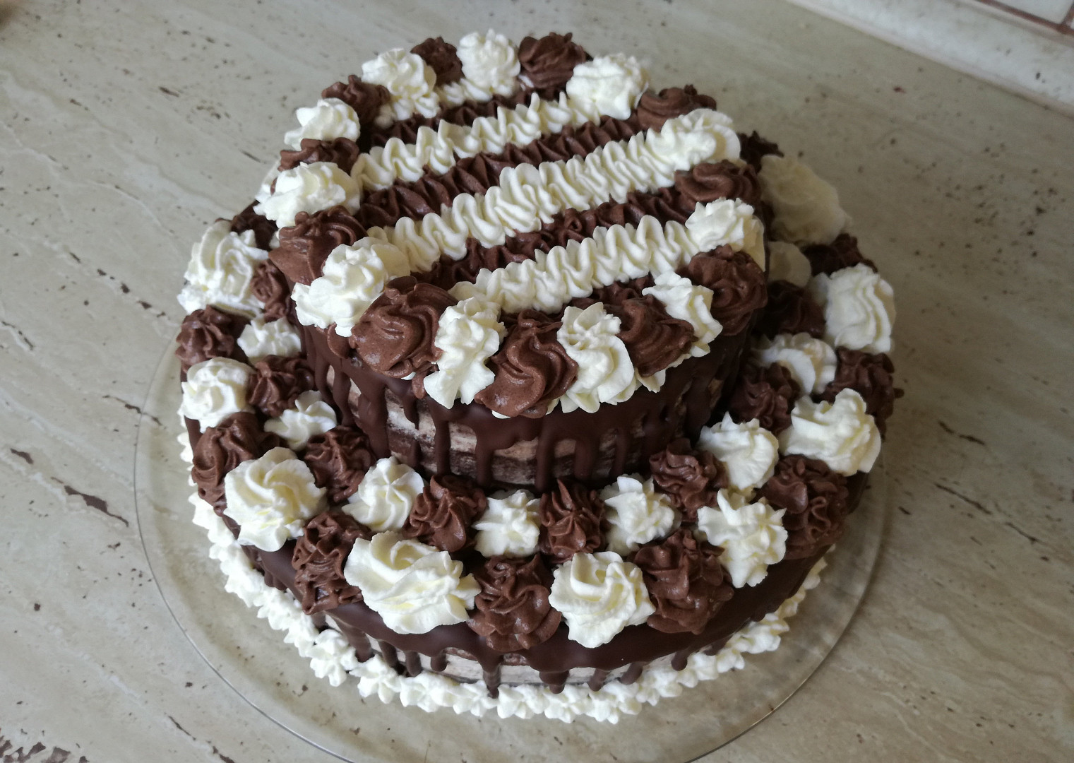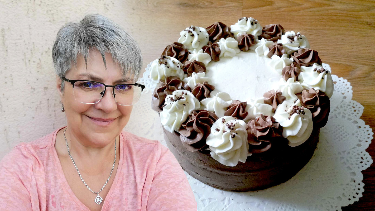 Harlekýn je retro dort našich babiček. Tmavý korpus zdobí šlehačka dvou barev Toprecepty, Iva Jechová a koláž Toprecepty