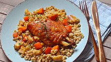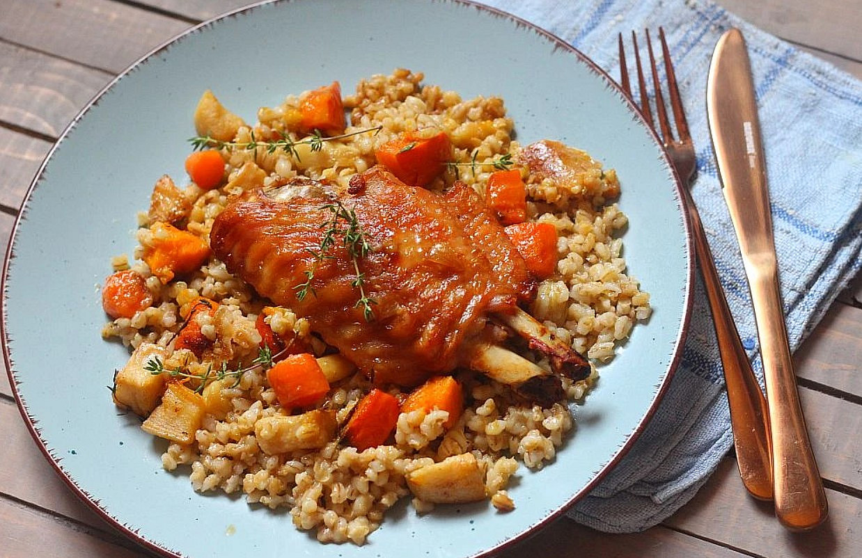 Krůtí křídla pečená s kroupami, dýní a kořenovou zeleninou Zdroj: Toprecepty