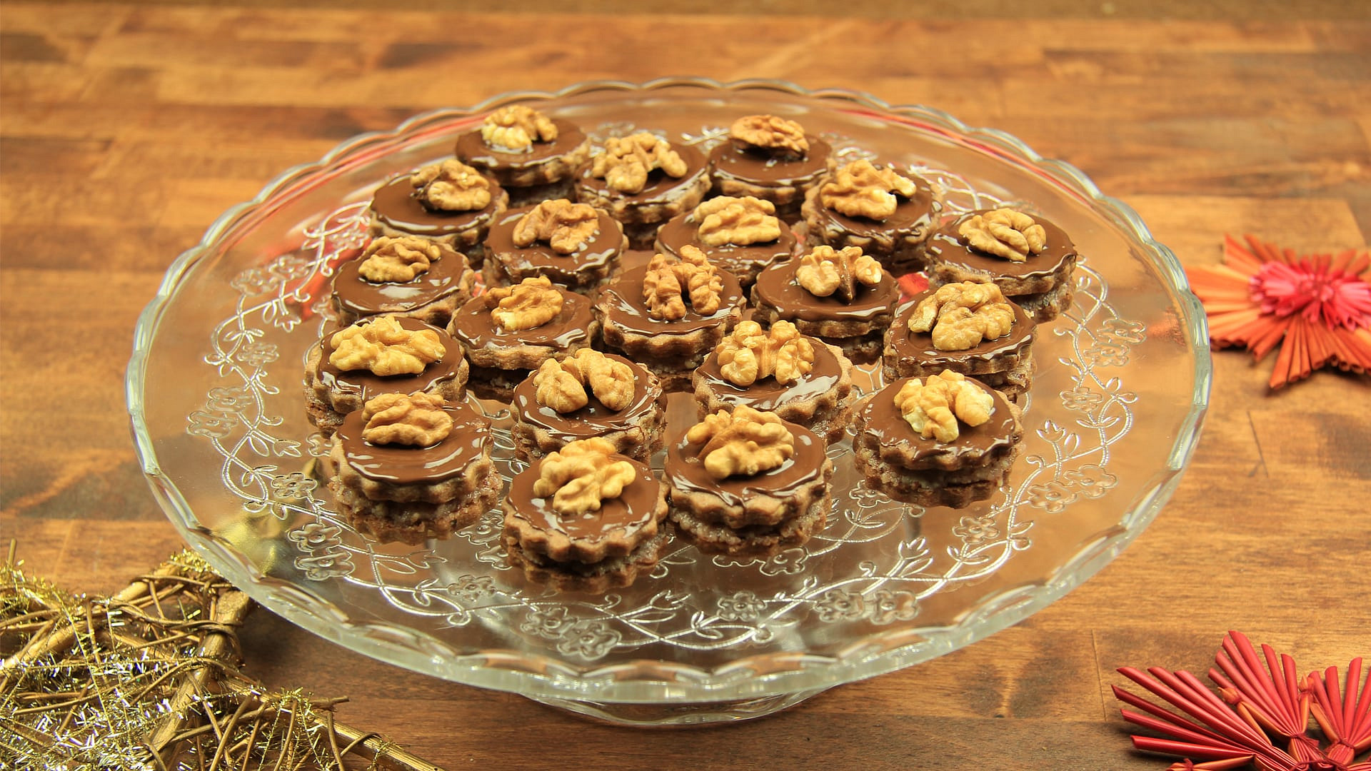 Na ozdobu si připravte čokoládovou polevu a na dozdobení půlky vlašských ořechů.