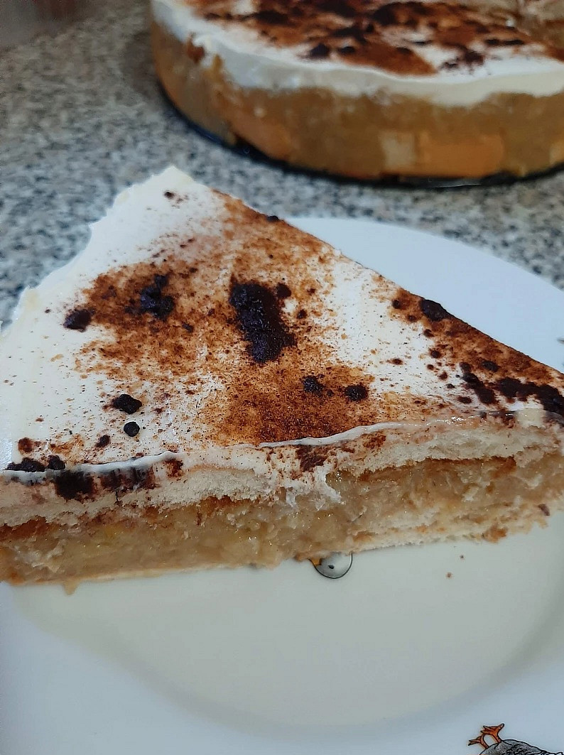 Jablečný lahodný moučník s banány a brusinkami, zdobený zakysanou smetanou Zdroj: Toprecepty