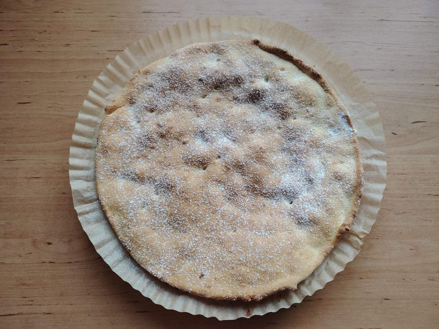 Koláč zakryjeme víkem a pustíme se do pečení. Pokud by povrch těsta rychle tmavnul, přikryjeme ho kolečkem pečicího papíru. Po upečení koláč sesuneme na talíř a necháme ho vychladnout, než ho poprášíme cukrem.