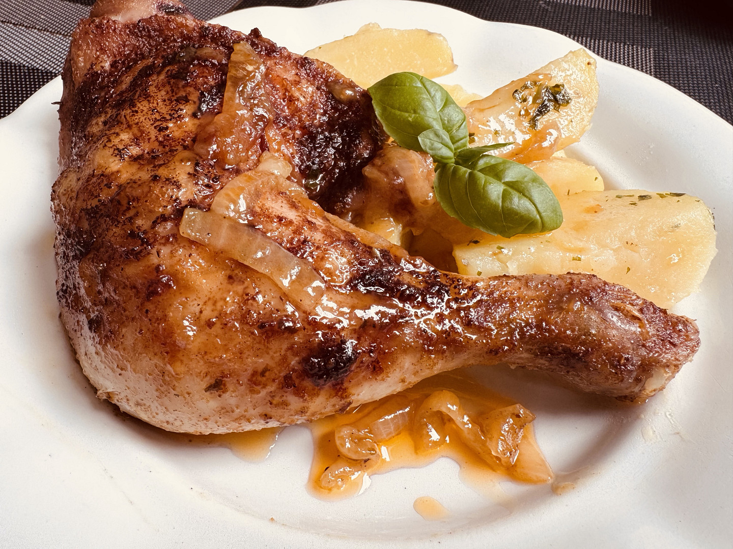 - Rozpůlené kuře pečeme kolem 1 hodiny. Přeléváme ho vypečenou šťávou.