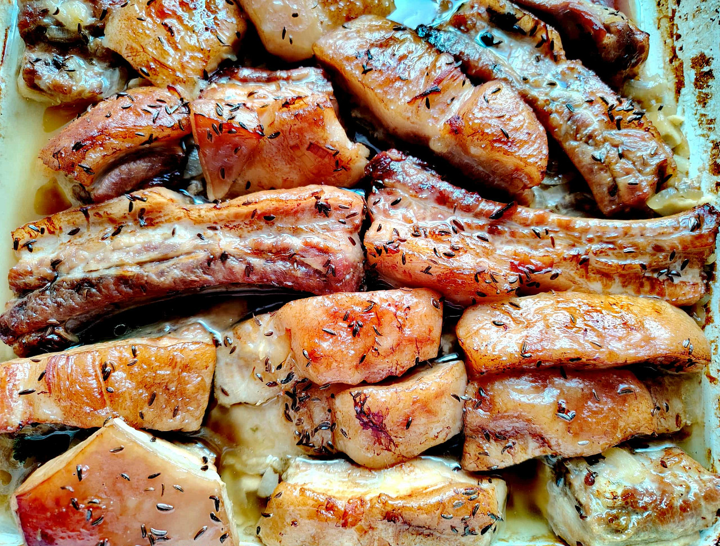 - Maso by mělo aspoň hodinu odpočívat, ale je lepší, pokud ho necháme v lednici přes noc. Ráno maso obsypeme cibulí a česnekem, podlijeme ho a posypeme kmínem. Bůček pečeme kůží dolů, pak ho otočíme a pečeme dočervena.