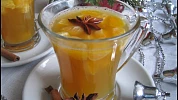 - Pomeranč nakrájíme na plátky, do hrnce nalijeme vodu, přidáme badyán, mletý zázvor, mletý muškátový oříšek, celou skořici a nakrájený pomeranč.