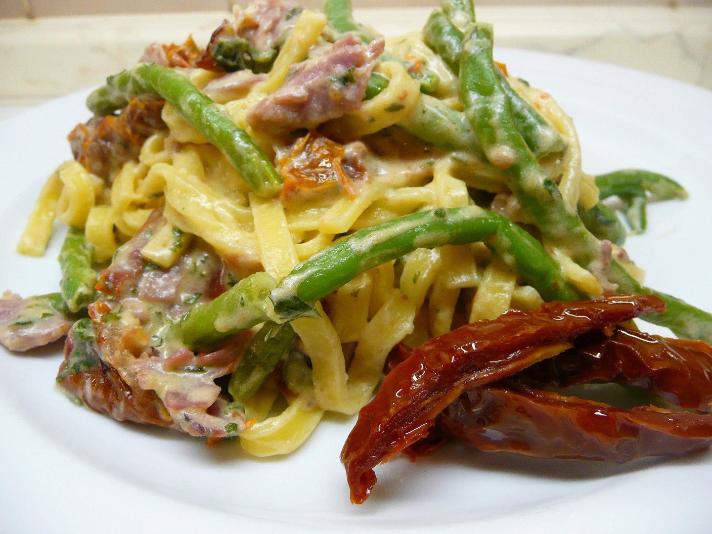 Jak uvařit fettuccine se šunkou a fazolkami? Pokrm báječně dochutí sušená rajčata