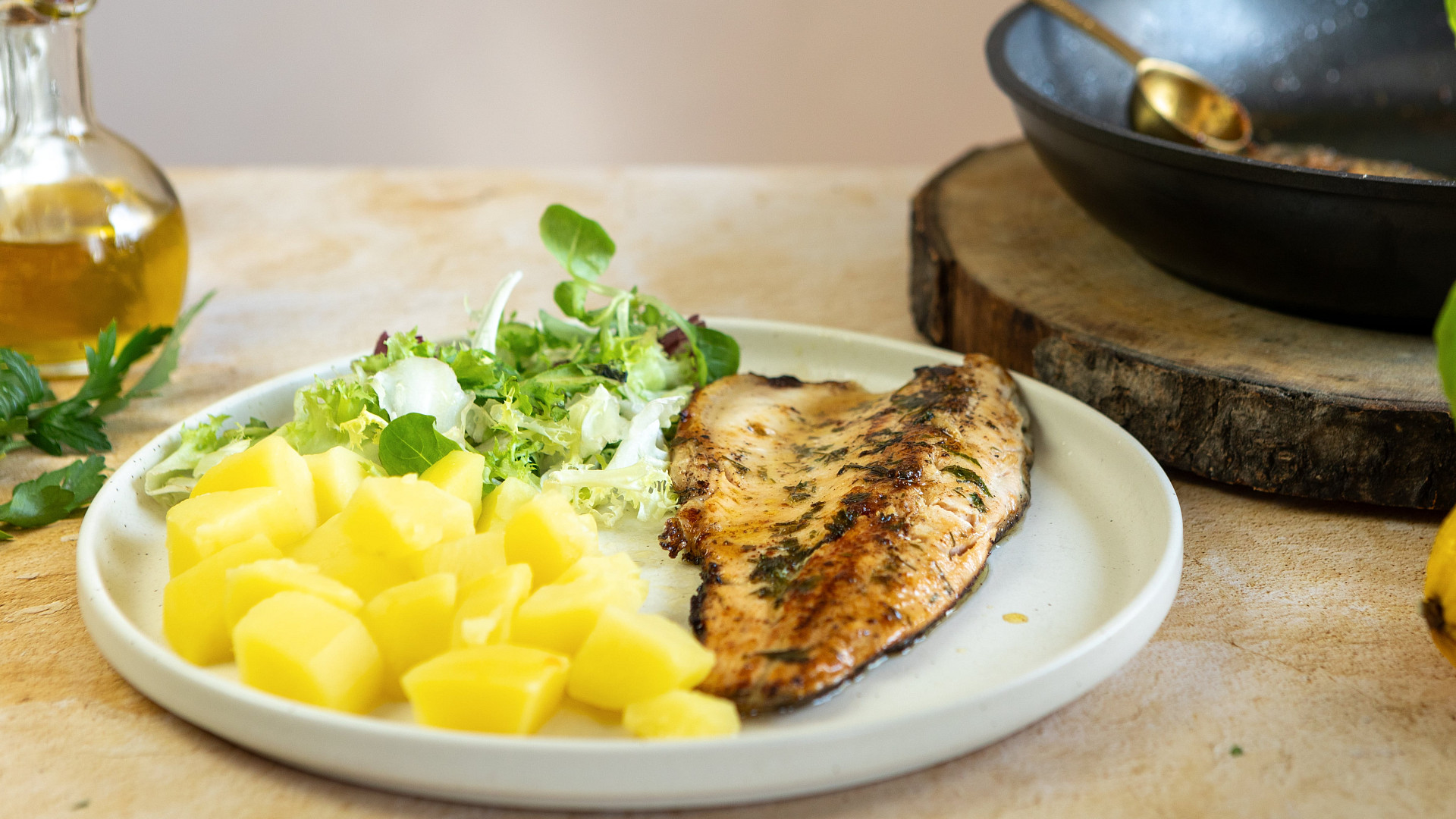 - Hotové filety ihned podávejte na talíř společně s vařeným bramborem a čerstvou zeleninou.