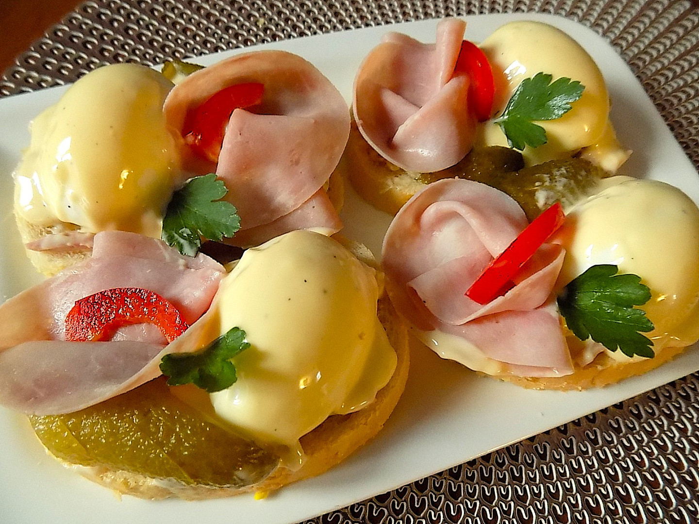 - Na 10 vajíčkových chlebíčků potřebujete: 10 krajíců veky, 10 plátků šunky a 5 vajec.