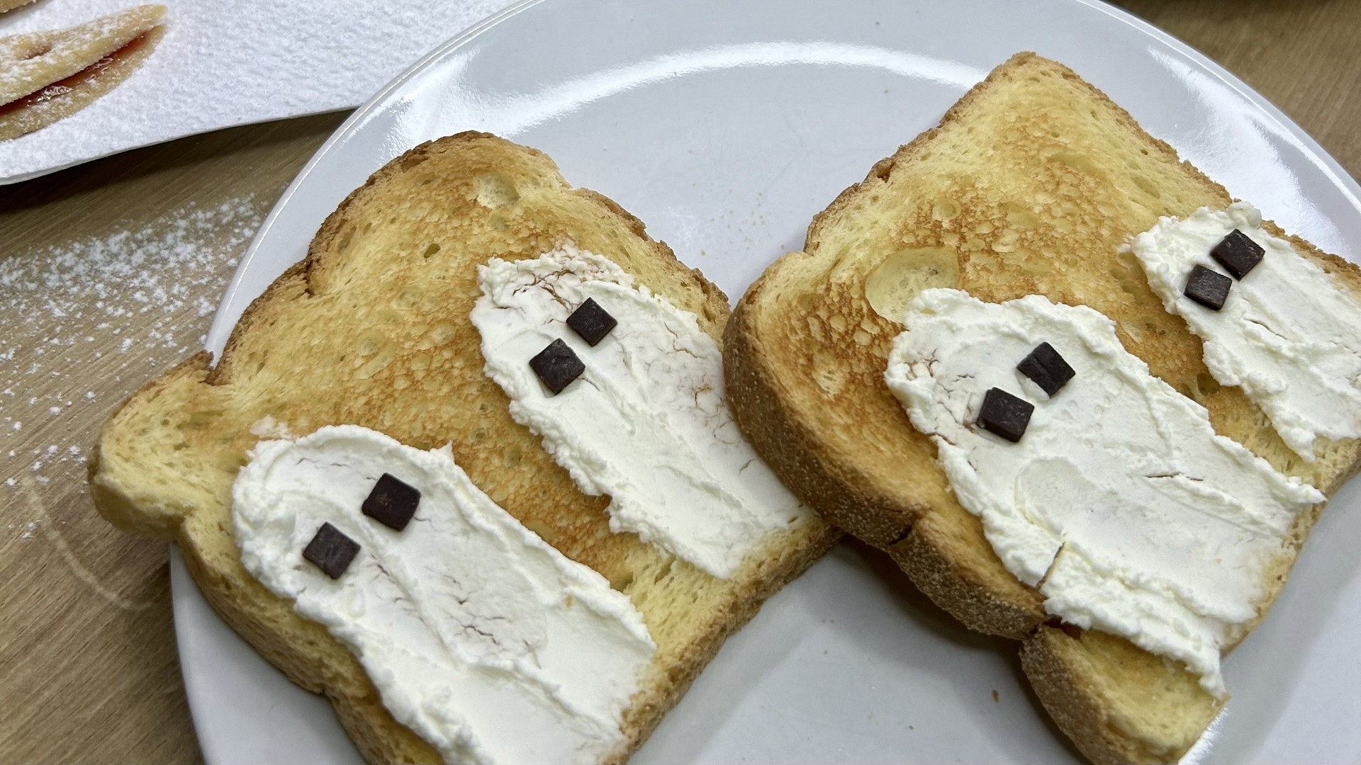 - Vyberte svoji oblíbenou pomazánku bílé barvy (žervé, pomazánkové máslo, lučinu) a mázněte ji nožem na toust tak, aby tvar připomínal ducha.