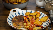 Krkovice naložená v hořčici, pečená s cibulí, paprikami a rajčaty Zdroj: Toprecepty